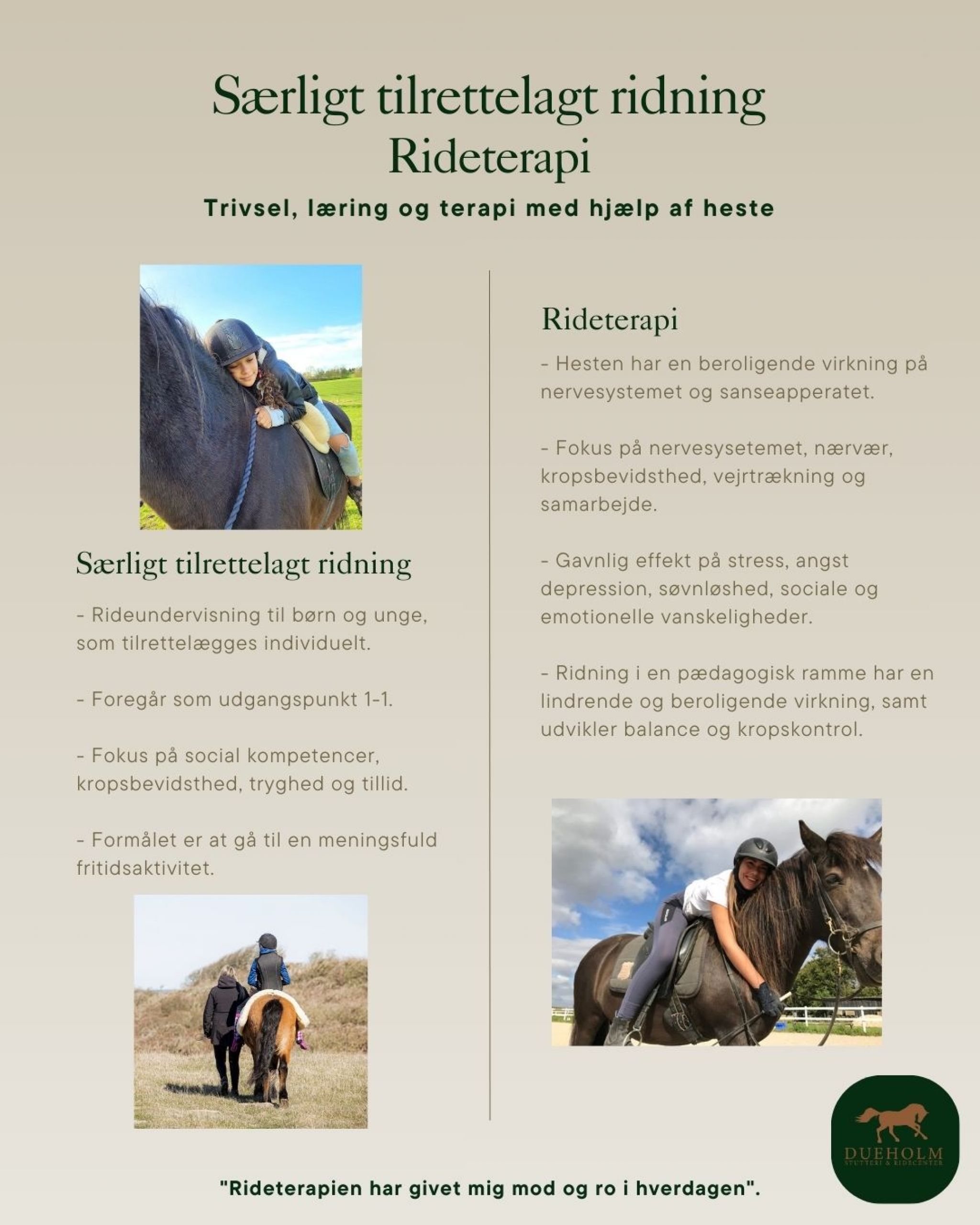 🔹 Rideterapi: her er fokus på terapeutiske mål, fx balance, kropsbevidsthed, sanseintegration, kommunikation eller følelsesregulering.